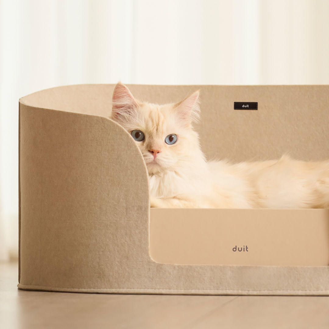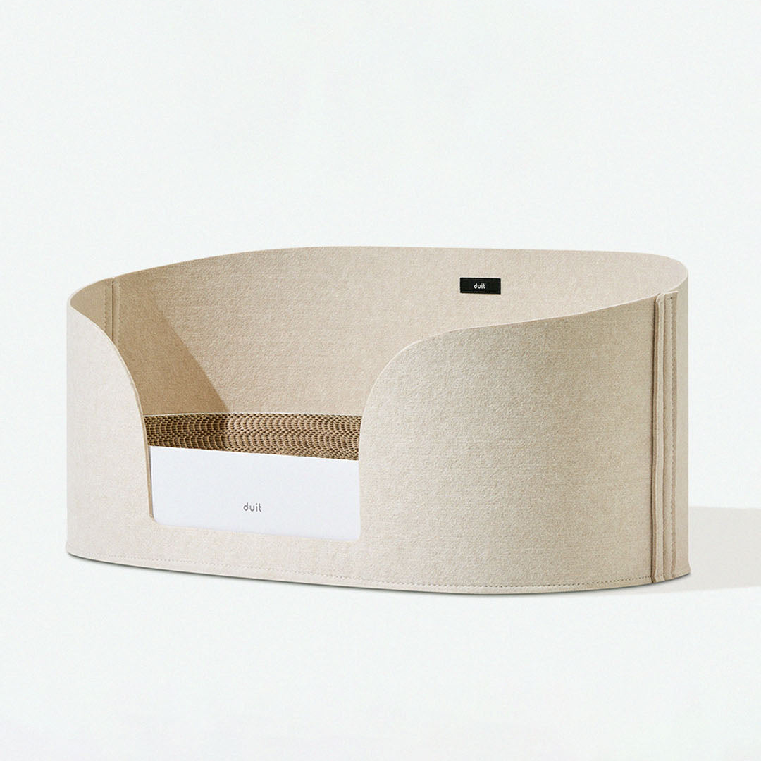 A cozy felt hideaway basket that works perfectly alone or pairs with the All Day Board scratcher for a complete cat sanctuary.