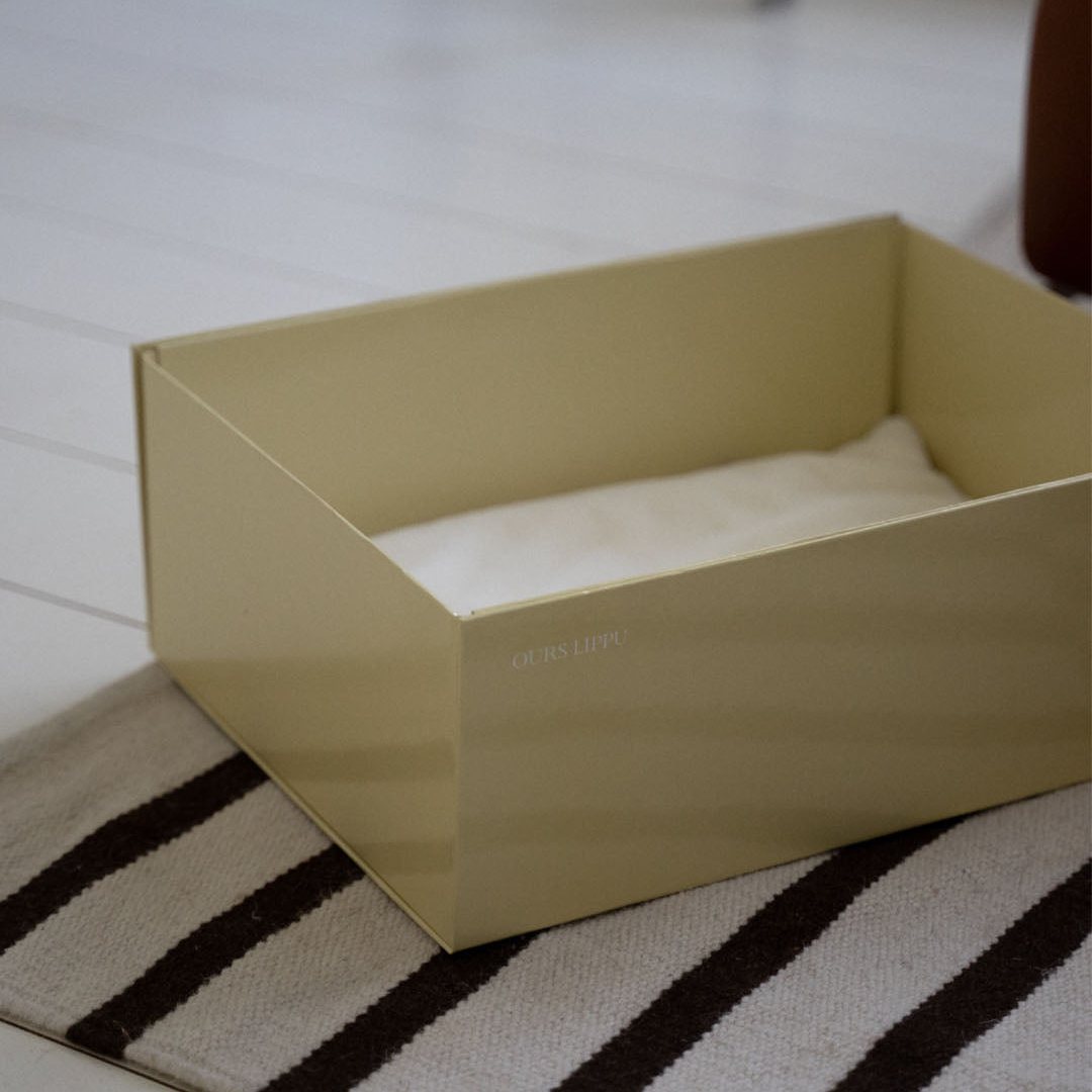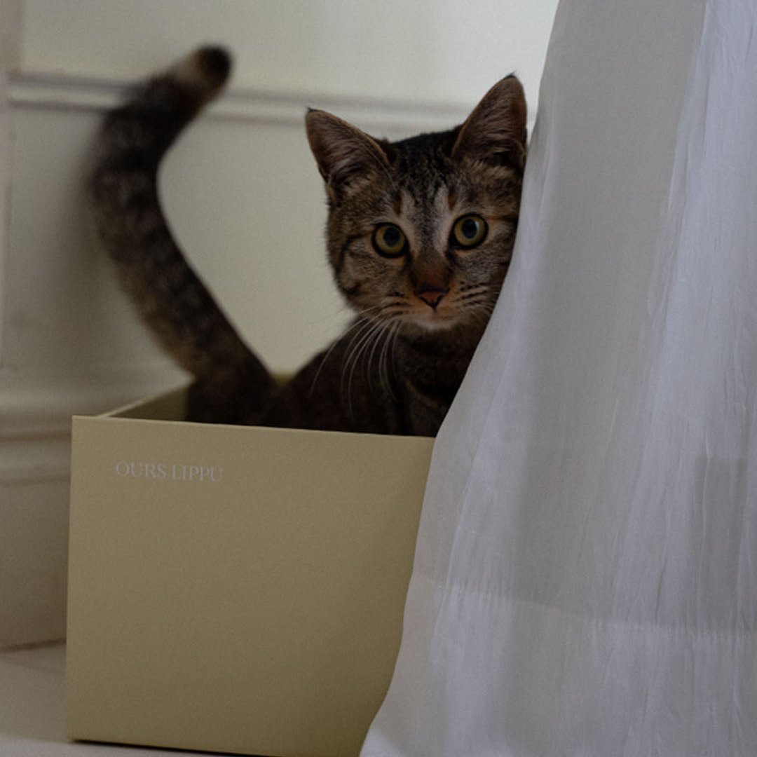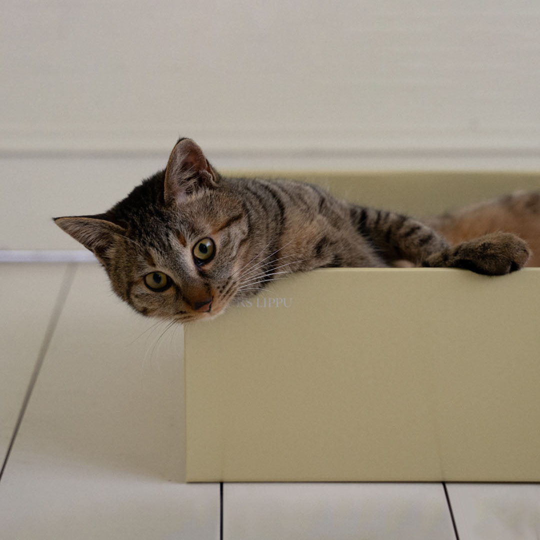 A premium FSC-certified paper scratcher box with glossy finish and unique texture, designed with a spacious 6 inch height for cats to comfortably play and rest inside.