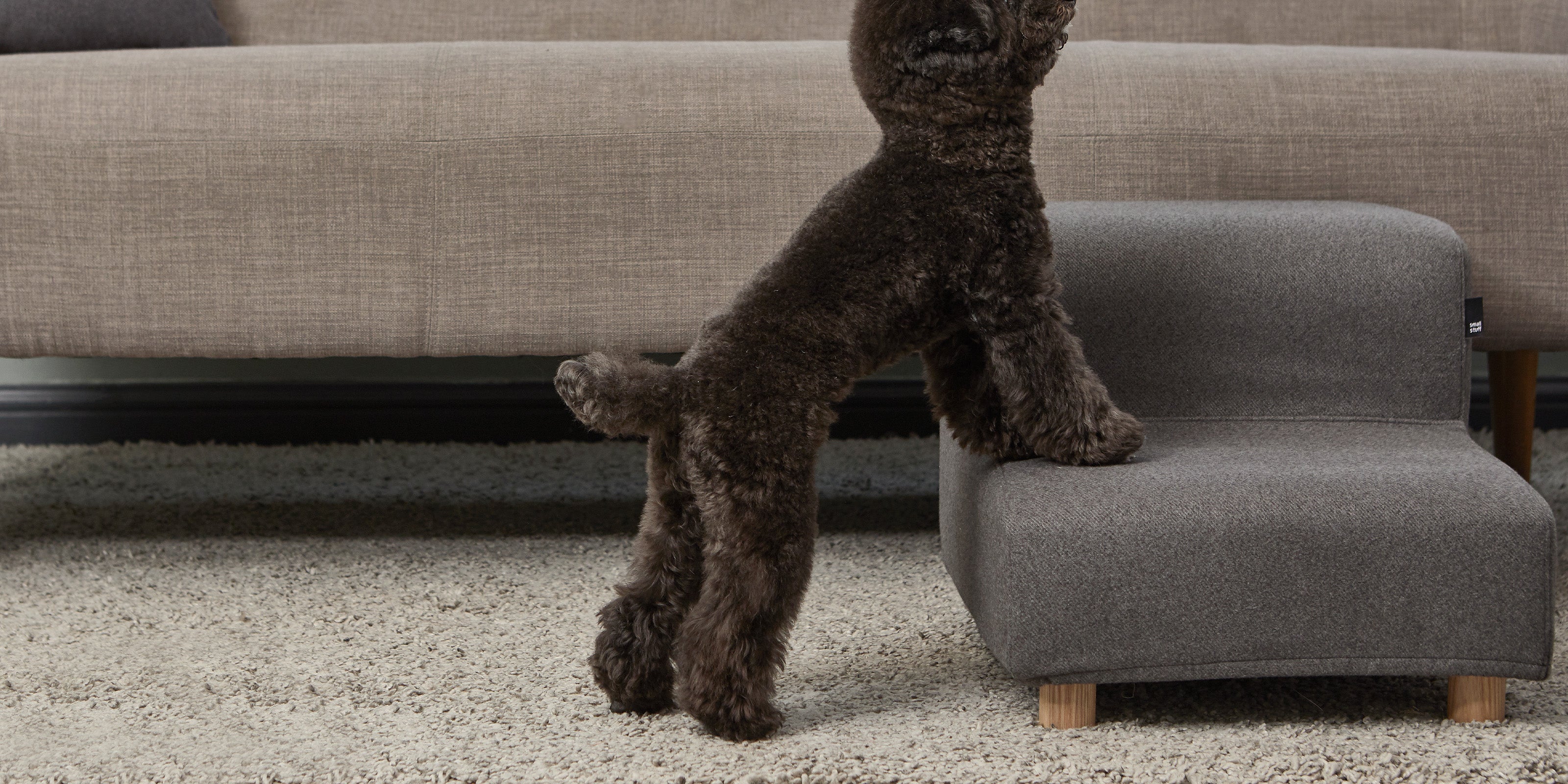 Cozy pet step with a soft silhouette provides a plush, joint-protecting solution, featuring a waterproof base and a washable cover for easy cleaning.