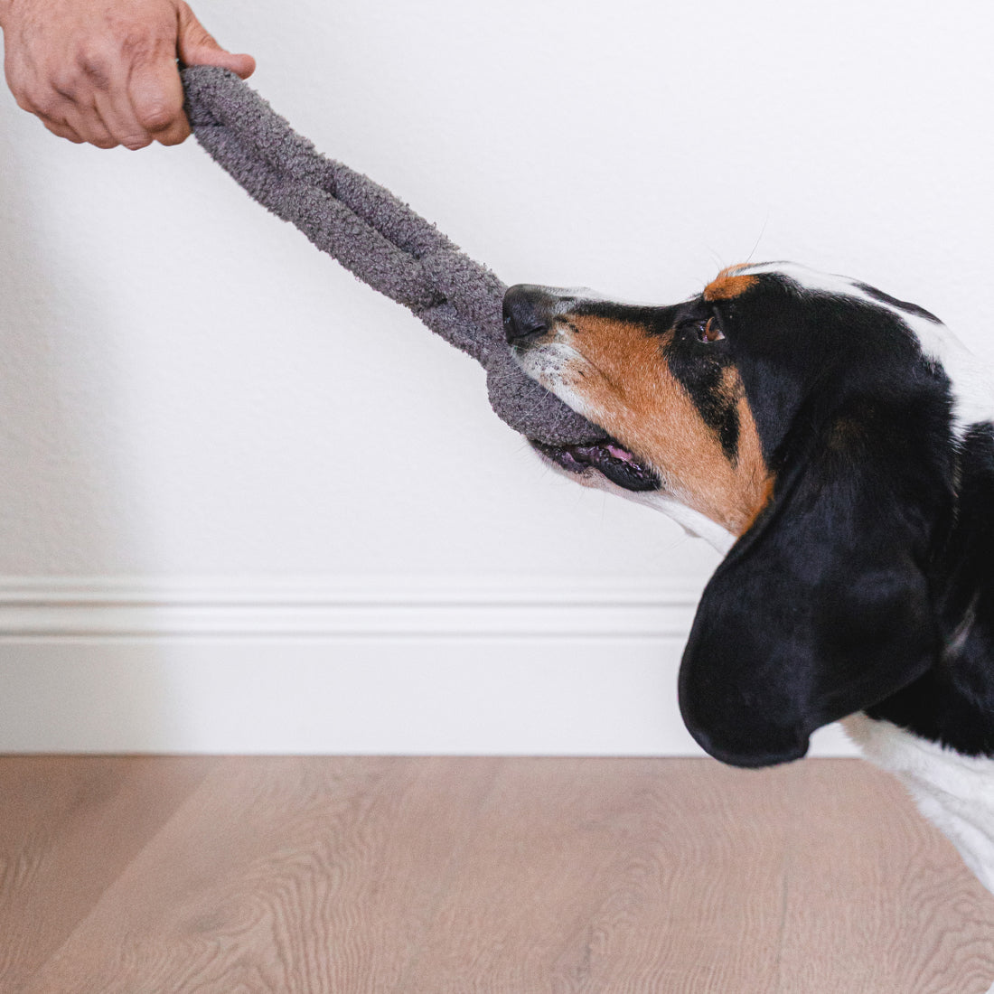 A chew rope meets a soft plush—designed for light tug and textured chewing.