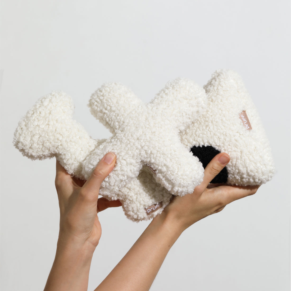 Squeaker inside. Soft boucle texture and plush "X" shape offer cozy comfort with a sound surprise.