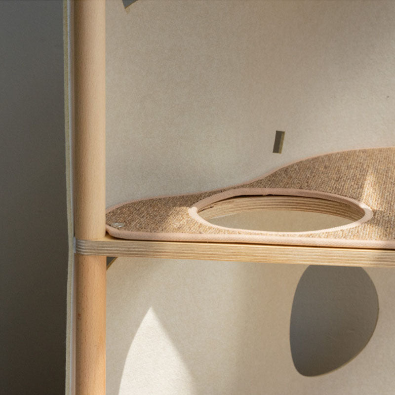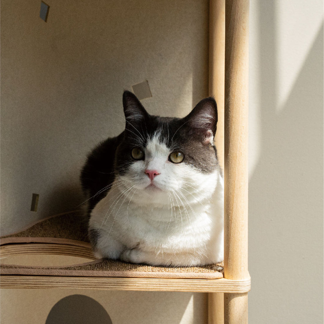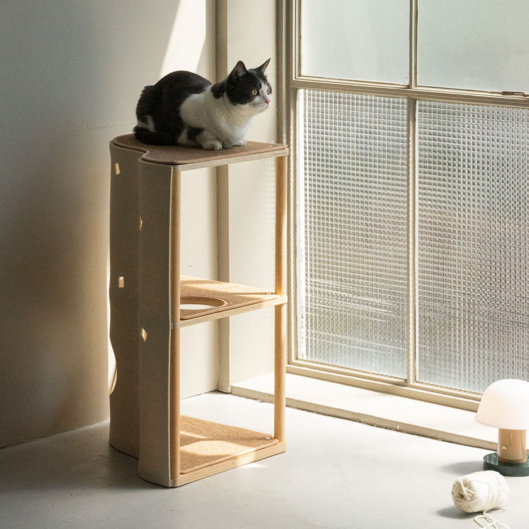 A sculptural cat tower with a curved silhouette designed to provide your pet with comfort and a playful, interactive space.